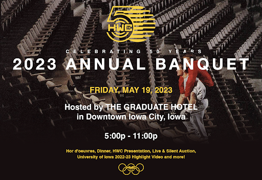 also spending a lot of time planning our Annual Banquet - 50 Years of Excellence, to be held Saturday, May 6, right here in Iowa City. Registration is now open! If you or someone you know is interested in sponsoring a table for the event, contact our team at banquet@hawkeyewrestlingclub.com or call (563)299-6453 for more information.